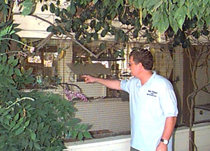 | Greg is actively involved in the budgie fancy. He is a member of the national club, ABS, and of several clubs in Southern California. These include: his local club, the Budgie Fanciers of San Diego County, a life member of the American Budgerigar Society, Great Western Budgerigar Society, and the San Gabriel Valley Parakeet Association. | ![]() Pointing out a few of the quality birds that might make the difference at his next show, Greg hopes these are the ones. |