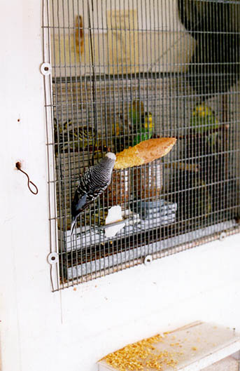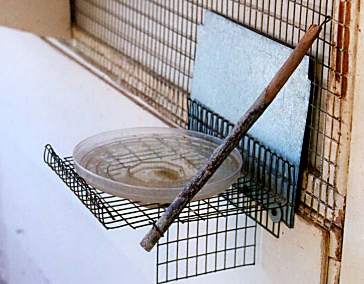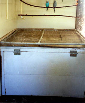 One of the things I have done in the flight to make the space more useable, as you can see in this photo, is to make a covered unit under the perches for storage. The door in front is hinged at the top and again at the middle. This bifold type of door allows me to open the door without having to take up as much space. Under the unit is where I keep steel cans for seed storage. To help make the cleaning of the flight easier, I have made a PVC frame and attached half inch by one inch welded wire with cable ties. Under the wire is sheet cardboard from large boxes. I just lift the PVC out of the way, roll up the cardboard, throw it away, and replace with new. The PVC frame is easy to remove from the flight to hose down, scrape, or wire brush as needed. The unit seen here is held together with two screws on each side so that is is also easy to remove from the flight for a through cleaning. | |