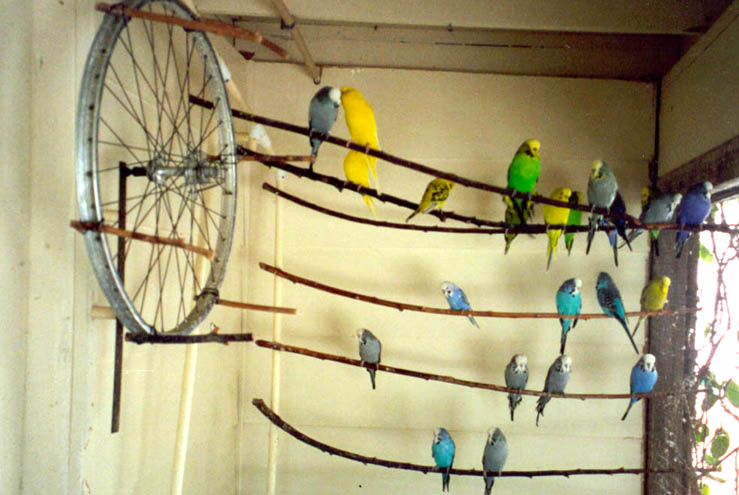 The Birds also really enjoy the bicycle wheel swing. Although none of the birds are on the swing at the time of this photo, they use it often. All of the perches in my flights are branches from the trees in the yard. I do not know how true it is, but I feel that the birds get a better chance to strengthen their feet by having to hold on to different size perches. | |