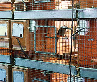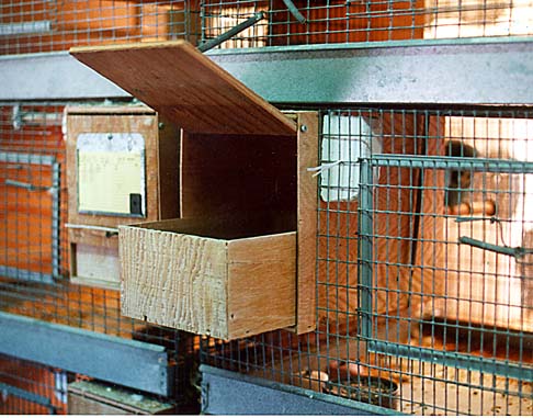 A 3 by 5 card holder is attached to the door of the nest box for record keeping. The sheet metal tray is a tray purchased from Morton Jones in Ramona, California. It is a standard utility cage tray. I designed the cage around the tray since that was the most difficult item for me to produce. | |