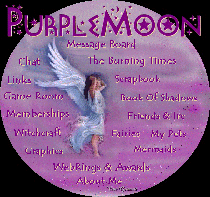Song- "Frozen by Madonna" Hi!! Hola! My page is always under construction I am updating today October 18, 1998 because I am getting requests by people to design graphics for them, and I am sorry to say but I can't right this moment, I am moving to South Carolina and I am pregnant with twins so is very difficult to stay on this chair for long periods of time, so I just work on my sites when I can, check the graphics page in few days I will have generic buttons so you can use them as you please but for now this is it..Most of the pages are uploaded by today even though I am fixing dead links and that stuff but be patient with me.. I edit by hand I don't use an html easy editor :) not that is something wrong with them I just like to do it myself....even though I use Netscape when I am in a hurry :) I don't discard them that quick... By the way the graphic Map was done by me with a lot of patience so don't think about taking the graphic I hold the copyright to it..If you want help to design a map just e-mail me and I will be happy to help you. When I get the time of course *~* Visit the organizations that I belong to, they are wonderful and I tell you this much you will enjoy to be in each of them, I know I do, All the people in them are angels brought to earth :) My URL: http://fly.to/purplemoon.com I got it for free at http://come.to [ About Me ] [ Awards ] [ Book Of Shadows ] [ Chat ] [ Fairies ] [ Friends ] [ Game Room ] [ Graphics ] [ Irc ] [ Links ] [ Memberships ] [ Mermaids ] [ Message Board ] [ My Pets ] [ The Burning Times ] [ Scrapbook ] [ Webrings ] [ Witchcraft ]