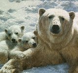 On this March morning, three small white heads appear at the breach in the den wall. The cubs were born in the snow den in December, blind, naked and helpless, and each weighing about 1lb (450g). Polar bears usually have one or two cubs - trip-lets are highly unusual. Their mother encour-ages the three-month-old 251b (11 kg) cubs out into the crisp morning air for their first sight of the icy kingdom where they must learn to wrest a living, but for several months "ill depend on their mother for everything. She will continue to suckle them for a month or so, and then they will gradually share her meals of seals and fish.