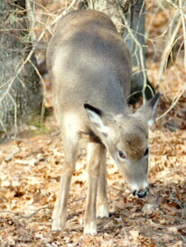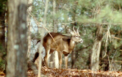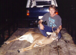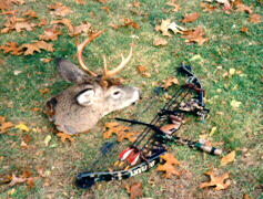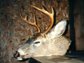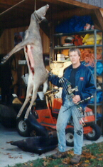 Now this deer has a story behind it. I got this 7 pointer the same year I got the 10 pointer. This one I got during the 1997 bow season. I never worked so hard for a deer. When he came in around 7:30am he was very cautious. My stand was limited to a few good shots. The area was extremely thick. He first headed right to an open lane I had made but he seemed to know something was up and he stopped in the thick. I was using a grunt call which ended up saving the day. He turned and headed back from where he came from so I grunted. I dont know if he didnt hear me or what but he kept walking. I grunted louder, nothing. Is he deaf? I let a loud one go....he stopped and looked back. He began walking parallel to me and then to my surprise he started shredding a sapling! I have never seen this so this was awesome! After thrashing the small tree, he began angling towards me. He was moving to another lane I had opened up so I drew my bow and got set. He was moving at a good pace, and I took the shot while he was moving. I was not a good shot but I put an arrow through him. I knew it was a gut shot so I waited and then walked home to call my buddy to help track him. So anyway I tracked that deer for 5 hours that afternoon, we saw him once. I figured we blew it and we headed home. I hunted the area again and I couldnt resist looking again(who could). Now I began thinking. It was 4 days after I hit the buck. I figured maybe crows would be swarmming his carcass if he was down somewhere. Well on the 4th day I went looking again. I was able to track him for about half a mile. He found a brook. This is it I thought. Then I heard a racket upstream...I looked and saw a huge swarm of crows sitting low in the trees and swooping down. My heart jumped. Is it him? I didnt waste any time getting over there and what I found was the half-eaten carcass of my buck! Coyotes had done a number on him. He wasnt even rotting yet. This was my first nice buck with a bow so I wanted to mount the head but all I could salvage was what is in the picture. Well at least I can say I got him.