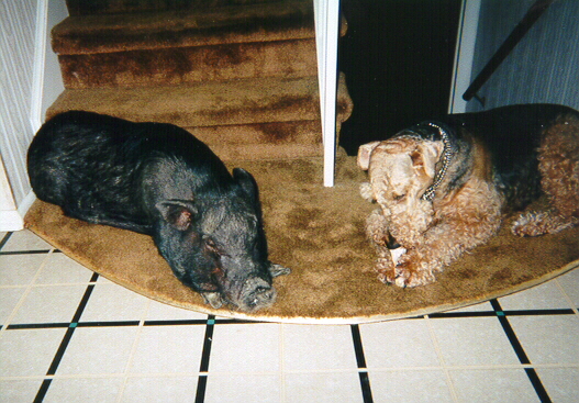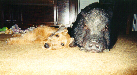 These are our two girls, Priscilla & Macy relaxing. We just recently lost Macy to the disease IMHA. They are doing a research study at Purdue University on this dreaded disease, hopefully someday they will find the cause and a cure.Priscilla(Vietnamese Potbelly Pig)7 yrs Macy(Airedale Terrier)was 6 in June of this year. | ||||||||||||||||