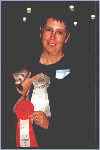 Then it was Squiggy's turn. I had entered him in the Kit Breeder class as he wasn't neutered yet. There were only 15 entries in that class. Squiggy's scores were 79.0, 75.3 and 76.5. He received a ninth place ribbon and a second place ribbon. ;-) We were very pleased with his scores and he did very well with the judges.If you ever get a chance, show your ferret - at least on time. It's a blast.