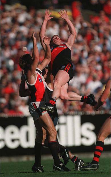 One of the great loves of my life. Although relatively unknown outside the realm of Australia this is our National Sport. I love this sport for its speed and free flowing action. It is game the cannot be dominated by one or two "stars" as it takes a solid team effort and plenty of thinking (not that other sports don't). AFL was recently acclaimed as the second most physical sport in the world (by American Sport Illustrated) second only to the Irish sport of Gaelic Football. The game is played on a 165m x 125m oval and it 4 x 25-30min quarters in duration. Coming from Victoria (the home of AFL) it is a sport the was engrained from a young age. I started my playing career with the Birchip u/11 at the age of 8, playing with the clubs u/15 premiership sides in 1990, 91,92 and 94. In 1994 I was fortunate enough to be selected in the Victorian-Country side to play in the Teal Cup (Australian U/17 Championships). In 1994 I also played 3 games for the Bendigo Pioneers in the Victorian State Football League. The following year I played most of the season with the Birchip Seniors (losing the Grand Final by 3 points- a heart wrenching moment) and again playing a handfull of games with the Pioneers. At the top level of the sport I support the Essendon Football Club and my favourite players are James Hird, Michael Voss and Paul Kelly. Oh and let me not forget the Great Athony -Plugger- Lockett. The Pic is an old school friend Gary -Tubby- Moorecroft mixing it with the best in the AFL. | |||||||||||||||||||||||