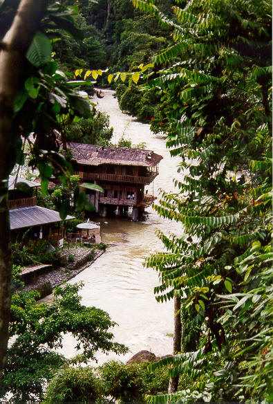 Ons hotel aan de rivier. Door het stromende water moet je s'nachts wel vaak naar en wc. Back to nature heette ons hotel en werd gerund door een Nederlandse die getrouwd is met een Indonesier.