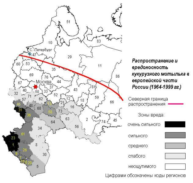 Карта 8. Кукурузный мотылек в Европейской части России.