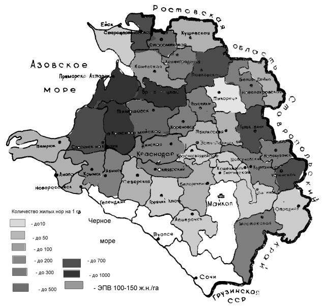 Карта 7. Мышевидные грызуны в Краснодарском крае (среднемноголетние данные).