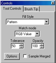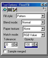 **In Paint Shop Pro 6 - when you left click the flood fill tool and left click the control panel icon - you will also get a box that will open up that looks different than in Paint Shop Pro 5. This box will say Tool Options - what you will do is this:
