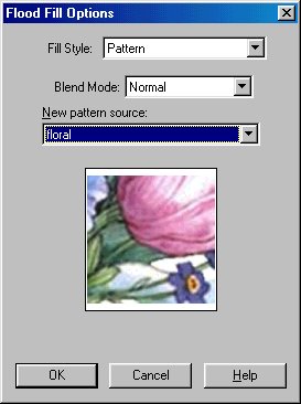 Then click on the grid next to the paint can at the top middle in this box - and another box will open - there choose the name of the pattern you will be using to flood fill. After you choose your pattern click the paint can at the top left of this box and bring the paint can to the image you want to flood fill and left click and you now have flood filled the white image with the pattern!