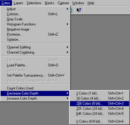 To begin with, the graphic must be 256 colors. If it is 16 million colors or a jpg you will need to reduce it to 256 colors. To do this you go to:
