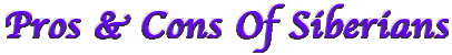 Please note that there are expections to all rules and these pros and cons only apply to most Siberians. There are some wonderful people out there that have taken their Siberians to high ranking Obedience titles and there are many Siberians who can get along with small animals without trying to eat them (generally only if they were raised with small animals as young puppies). I think that it is very important to really research the breed that you intend to buy before you buy it. I think that you will find that most responsible breeders are more than willing to talk about not only the good points of their breed but that bad as well. Also it is very important to look in potential health problems that a breed is known for. For instance, in the case of Siberian Huskies, juvenile cataracts and hip displaysia are the two major health concerns. Before you buy a Siberian, make sure that the parents were free of these two problems. And if you can make sure that the grandparents were clear as well, all the better.