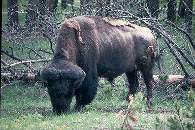 Yellowstone's wildlife is as spectacular as the hydrothermal features. Because of the park's remote location, and because of its large size, animals roam freely and are able to live in a natural way much as their kind have lived for centuries. Large animals in the park are not hunted, herded or fed. Because there are many areas within the park with panoramic views or where meadows break up forested areas it is relatively easy to see the wildlife in its natural state. Many kinds of animals have little fear of people and can be approached fairly closely. The animal which comes first to mind when Yellowsont is mentioned is probably the buffalo, the largest land mammal in North America. [see picture, left]These animals, such as the one pictured at the leftpeacefully munching grass, can be seen all over the park, in herds with many other animals or alone. Moose can also be seen along waterways and in clearings. These large animals may weigh up to 1400 pounds, stnad seven and one half feet at the shoulder, and have antlers which may spread up to five feet. They feed on willows and aquatic vegetation, such as water lilies. The bull below was sighted in the northern section of the park. Wapiti, or elk, are also numerous; about 38,000 of these animals currently roam the park, as their progenitors have done for 12,000 years. Male elk typically weigh 600-1100 pounds and stand five feet at the shoulders. Females weigh from 450-600 pounds. | ||||||||||||||||