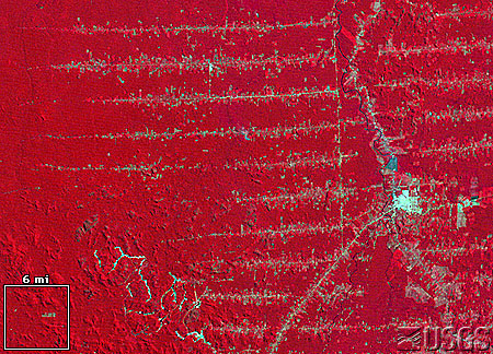Below are some aerial images of growth in the Brazilian state of Rondonia, which is in the Amazon Rainforest. Notice how over the years the Amazon's supply of trees are depleting. The deforested land and urban areas appear in light blue; healthy vegetation appears red. The first image is from 1975, the second from 1986 and the third from 1992. | |||||||||||||||||