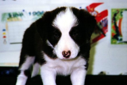 This is Gus. He is the nephew of Scooter, pictured above. Gus is a traditional marked CHOCOLATE male, with a medium/short coat. He is commonly refered to as Polar Bear Dog, PBD, or Houdini. Gus wants to lay in the shade, not the sun. In the dead of winter (not that it gets too cold here in Phoenix, AZ) he is IN THE POOL at NIGHT. While at his "grandparents" house, he made a jail break. Opening several VERY HARD to open door, shutters, and roll up blinds, not to be outdone, he opened the front door and forgot it was self locking. What a silly dog. A special thanks to Kim Hastings in TX. She is the proud "grandma" of 2 litters of CHOCOLATE border collies, including Gus's "to be" girlfriend when she grows up! Her picture will be comming soon. | ||||||||||||||||