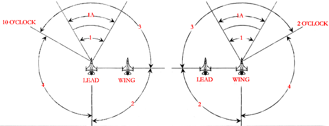 ![]() Remember, different formations lead to slight alterations in visual lookout. The below illustration is for a basic battle formation and provides maximum six o'clock coverage for both fighters.