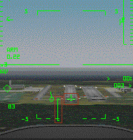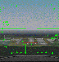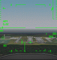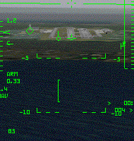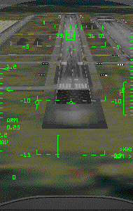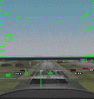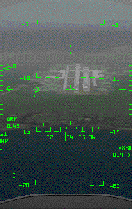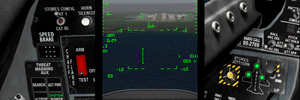 Perhaps most people who land using Falcon 4.0 monitor their Flight Path Marker (FPM) and airspeed above all else. The approach that I outline below ignores airspeed and places emphasis on the AOA bracket. By using the FPM and AOA bracket, you can do very nice landings at any weight without having to monitor airspeed at all. In fact, you will notice that the airspeed isn't displayed at all in any of my screenshots below! Once you are on the glideslope and your speed is low enough to drop your gear, you can ignore airspeed and focus on landing using the FPM and its relation to the runway and the AOA bracket. Once you follow the proper procedure for landing, your airspeed will be exactly where it should be automatically.