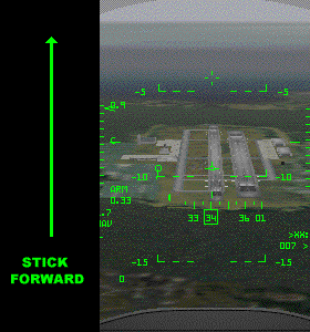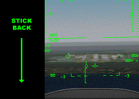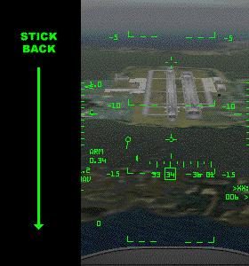 3. Keep the FPM on the front of the runway (stick) and the FPM at the top of the AOA bracket (11 degrees AOA) (throttle).