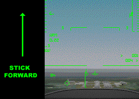 Now all you need to do is hold it there! Below are four /images showing glideslope alignment problems and their solutions. They are basic and pretty understandable. In this first image the FPM is below the runway threshold. All you simply need to do is pull back on the stick to get yourself back on the runway. Make sure you are still on the glideslope.