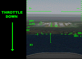 OK, so that is basically it. You will want to control the location of the FPM with the stick and the AOA with the throttle. Once you get used to this then landing becomes easy. Once all three conditions are met and you are on a proper approach your speed will be exactly where it should be (about 140 kts for a light aircraft and 170 kts for a heavy one). This approach of monitoring the FPM marker and the AOA bracket is helpful in that you don't have to worry about proper speeds for proper weight. Many F4.0 pilots find themselves falling out of the sky because they attempt landings using speed and get their speed wrong (too slow). A high airspeed results in lower AOA landings that could have dire consequences in the form of bouncing or crashing. Staying on the glideslope with a proper AOA keeps you from having to worry about airspeed at all.