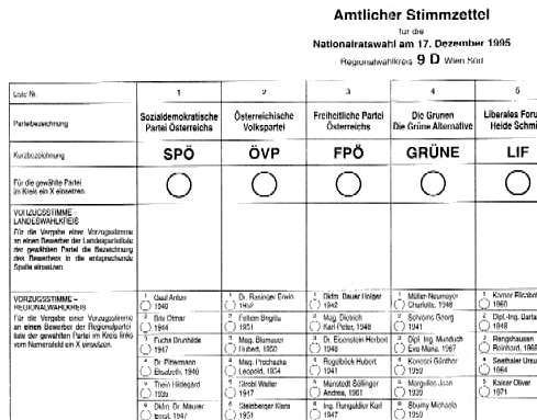 Die wahlwerbenden Parteien sind in den Wahlbehörden nach dem auf der jeweiligen Ebene zuletzt erzielten Wahlergebnis (Sprengelwahlbehörde: nach dem in der Gemeinde erzielten Wahlergebnis) paritätisch vertreten, wobei auf jede(n) Beisitzer(in) ein(e) Ersatzbeisitzer(in) kommt. Zwei der Mitglieder der Bundeswahlbehörde stammen aus dem richterlichen Stand. Rechtsquelle für die Durchführung einer Nationalratswahl ist die Nationalrats-Wahlordnung 1992. Sie ist Bestandteil des Internet-Angebots des Parlaments. Die letzte Nationalratswahl fand am 3. Oktober 1999 statt (die 20. Gesetzgebungsperiode des Nationalrats hätte im Jänner 2000 geendet, jedoch hatte der Nationalrat in seiner Sitzung am 16. Juli 1999 seine vorzeitige Auflösung beschlossen). Wenn Sie Auslandsösterreicher(in) sind und an der nächsten Nationalratswahl teilnehmen wollen, beachten Sie bitte die Seite Informationen für Auslandsösterreicher(innen). |