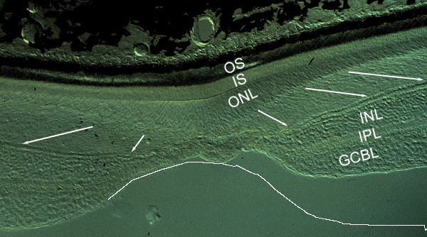 Compared to the foveal region, the peripheral retina looks rather simple. The cells are larger and less complex, there is only one row of photoreceptor with mixed rods and cones, only one layer or retinal ganglion cells which are not even packed very densely.
