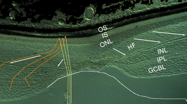 O.k., back to the retinal vs cortical magnification factor in monkey or human. Below, the path of a few light beams is superimposed on the monkey fovea from above (yellow lines). At the vitreo-retinal interface the beams are refracted away from the center of the fovea until they hit the photoreceptors. The orange lines show the further destiny of the (now neuronal) signals. The first step involves a slight bending towards the periphery on the level of photoreceptor inner segments and cell bodies. The major distortion occurs on the level of the photoreceptor axons (Henle's fibers; HF) that transmit the signal to the terminals (cone pedicles) at the point of the arrows. The next level of distortion occurs on the way through the INL, based on the architecture of the bipolar cells. The last step in this regard involves the dense packing of the retinal ganglion cells. since each retinal ganglion cell occupies the same space in the brain, the stacking of these cells into multiple rows alone will already result in a dramatic over-representation but it is the entire retinal architecture which is responsible for the retinal magnification factor in its full extent.