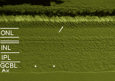 The primate retina is a bit more complex than the retina of a turtle. In general the cells are much smaller and more densely packed. This makes it substantially more difficult to investigate the morphologic features of these retinas which is one of the reasons why so much research is done on cold blooded species. Still, many features of the monkey retina bear a striking similarity