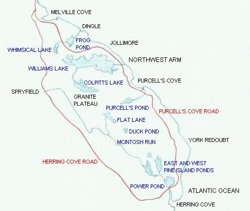 Map of the area in which the photographs were taken On this map the two main roads in the area, the Herring Cove Road and the Purcell's Cove Road, are drawn in red. Blue is used to sketch lakes, streams, the McIntosh Run and the Atlantic coast (on the right-hand side of the map). The Northwest Arm is a narrow arm of the Atlantic Ocean which separates the area shown on the map from the Halifax peninsula. Click here to see a map of the larger area. |