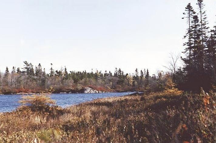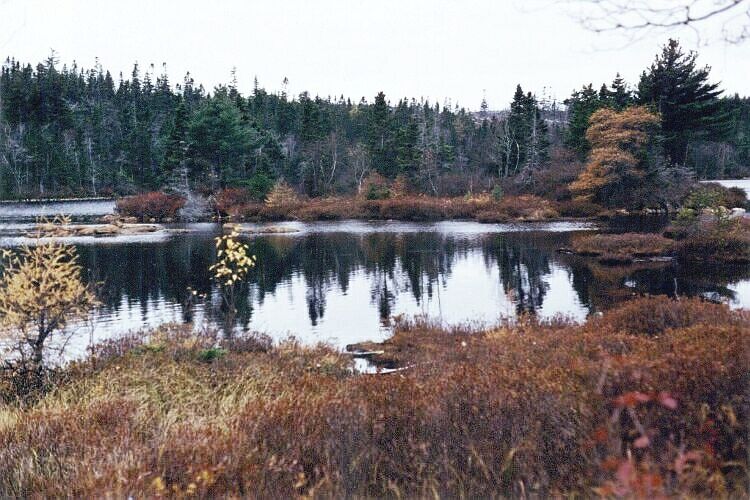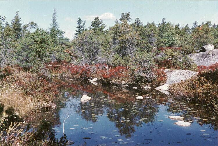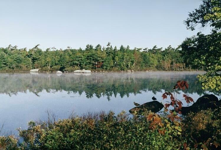 The lake and the Atlantic Ocean viewed from a ridge in the autumn Autumn view of the head of a small bay Trees and shrubs on the east side of the lake in the autumn |