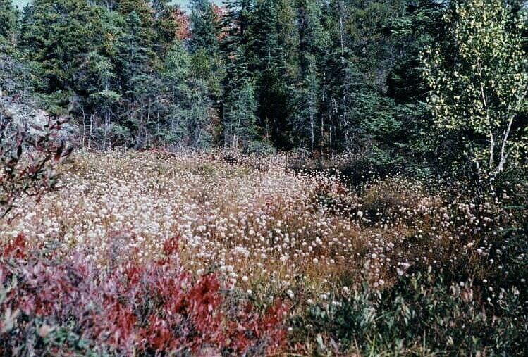 Autumn view of cotton grass and pine trees Autumn view of cotton grass and tamaracks |