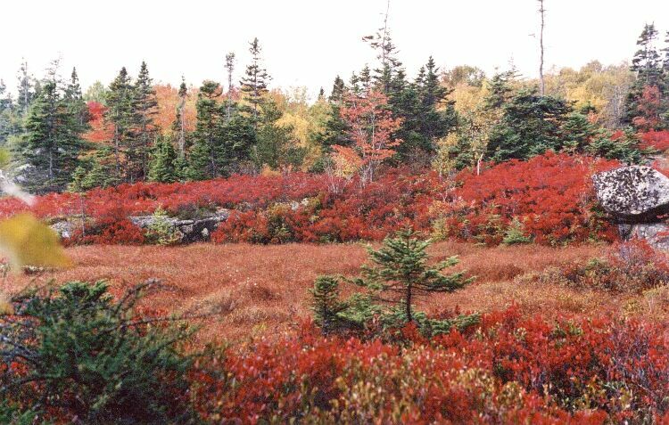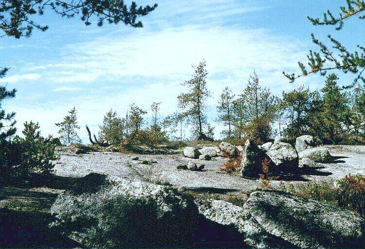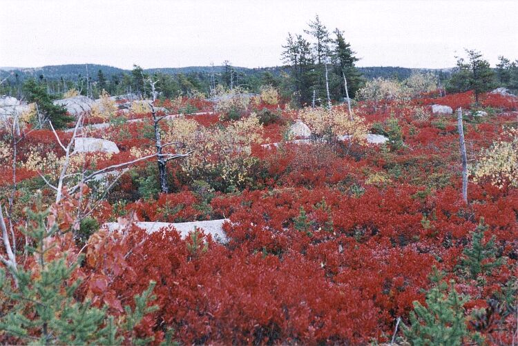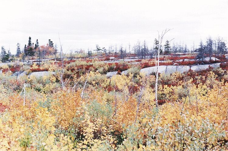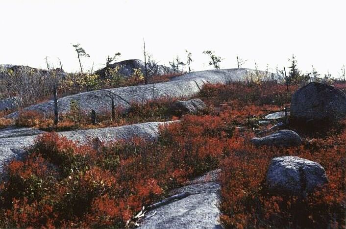 Jack pines atop the plateau The plateau in autumn Red autumn shrubs Strips of granite |