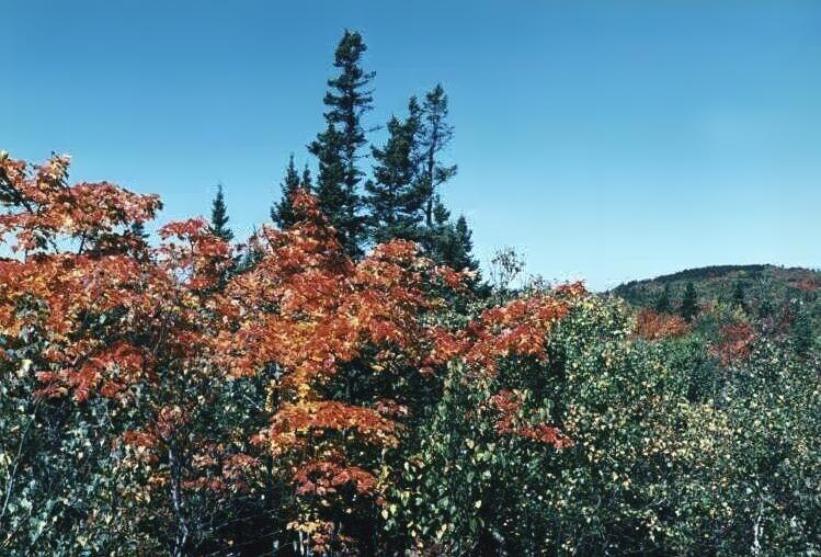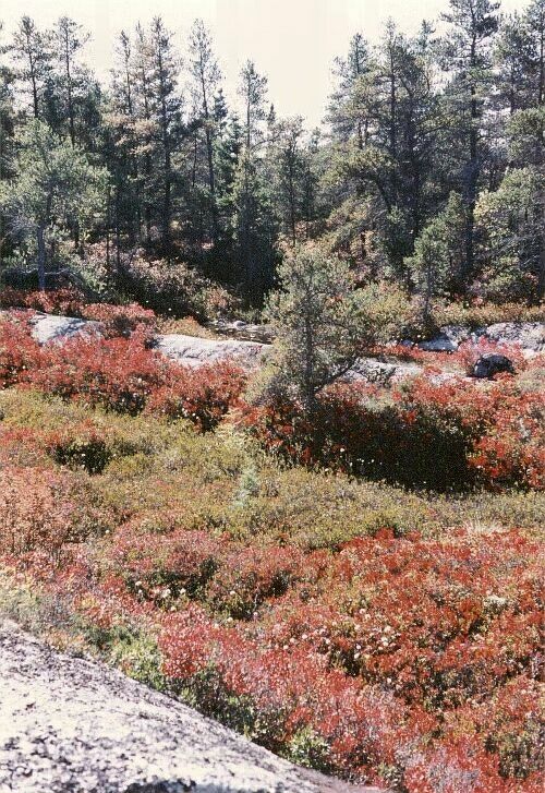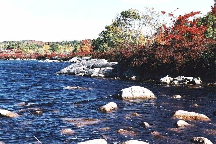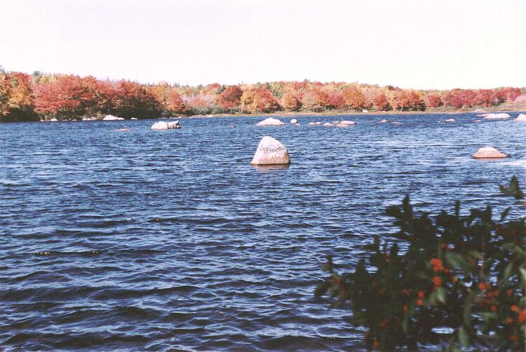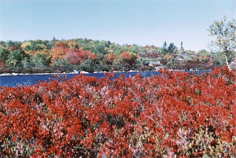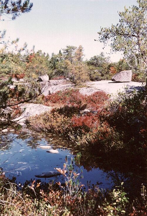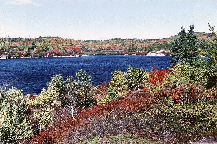 At the southern end of West Pine Island Pond we look across to the western shore, admiring the deciduous trees that grow there. Next we go up on to the ridge between East and West Pine Island Ponds. There we have another view of West Pine Island Pond. We also have an excellent view of East Pine Island Pond and the Atlantic Ocean. The view of the lake and the ocean changes as we proceed along the ridge. The ridge itself is very beautiful. The trees on the ridge are still largely green, and this greatly affects the impression created by those that are not. Descending from the ridge, we reach the northeast corner of West Pine Island Pond, where we can admire at close quarters the superb and varied colours of the deciduous trees lining the shore. |