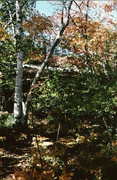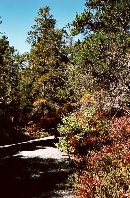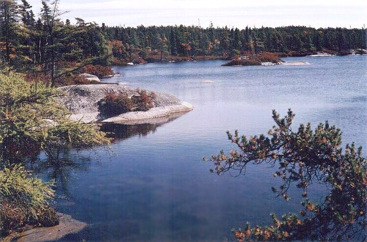 Spryfield - Colpitts Lake - Granite Plateau - Flat Lake | Under blue skies we walk from Spryfield to the north end of Colpitts Lake, where we enjoy the fall colours of the mixed forest. We walk along the western shore of the lake and up on to the granite plateau. On the plateau we walk along strips of granite flanked by jack pines and shrubs. We descend from the plateau and, glancing back through the deciduous woods at the edge of the plateau, we continue on boggy ground until we reach a strip of granite that leads us to the north end of Flat Lake. |