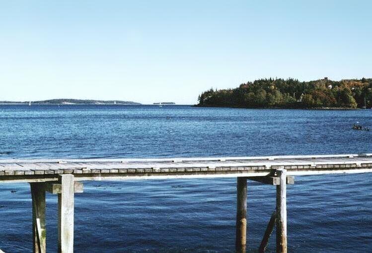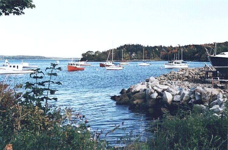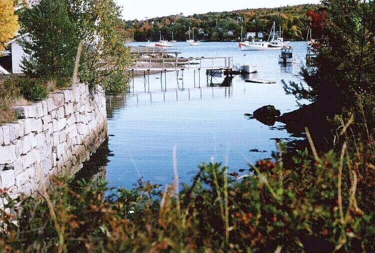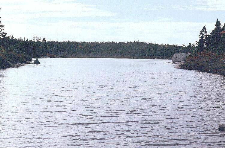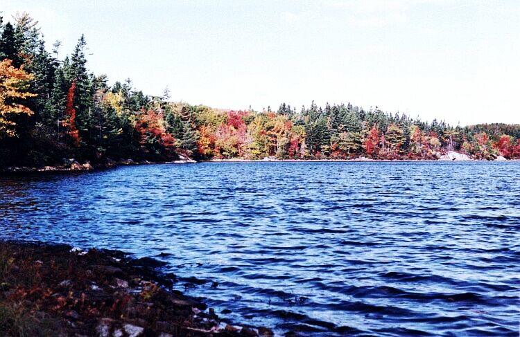 Granite Ridge between Colpitts Lake and Flat Lake - Purcell's Pond - Purcell's Cove | Next we climb on to the granite ridge that lies between Colpitt's Lake and Flat Lake. As we approach the crest of the ridge we have a view of Flat Lake through the trees. From the crest we have a view of Purcell's Pond and Halifax Harbour. Descending from the ridge, we make for the east end of Purcell's Pond, where the colours are very subdued because the sky has clouded over. We follow the stream that flows out of the east end of the lake to the sea. We arrive in Purcell's Cove, with its anchored boats and its view across Halifax Harbour to McNab's Island. |