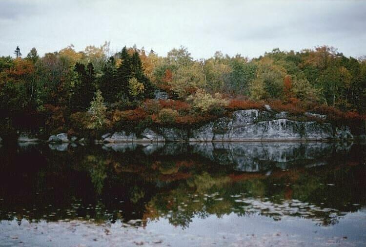 October 18 Spryfield - Granite Plateau - McIntosh Run - West Pine Island Pond | Starting in Spryfield, we cross the McIntosh Run and climb on to the granite plateau. The colours are spectacular, even though the sky is clouded. The patterns of colour vary. A boggy patch has different vegetation from the rest of the plateau. Sometimes the scarlet-leaved bushes predominate, but on other parts of the plateau the tone is set by birches, jack pines or other vegetation. Next we descend to the McIntosh Run and walk along its banks to West Pine Island Pond, where we see this beautiful fern, and admire the fall colours on the granite shore which is reflected in the water. We also encounter a beautiful combination of lichen, wintergreen leaves and blueberry plants growing on the shore of the lake. |