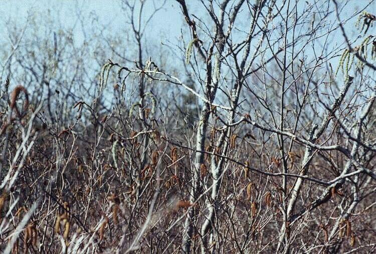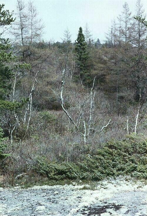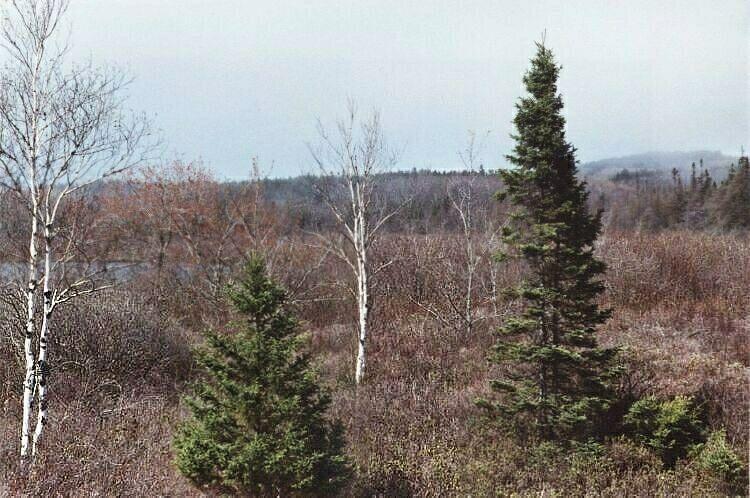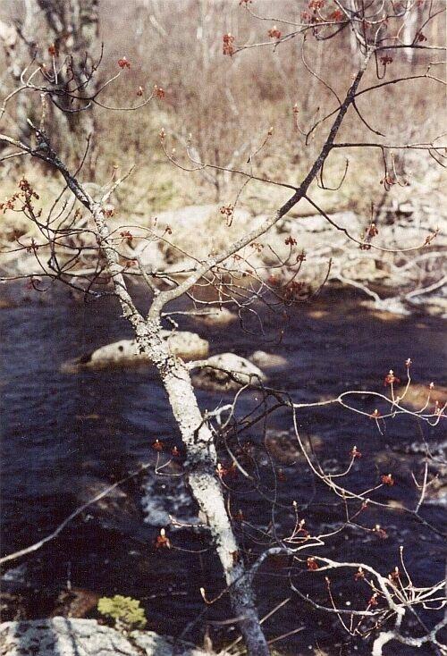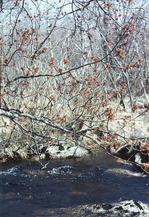 Spryfield - McIntosh Run | Starting in Spryfield, we are walking along the McIntosh Run at the very beginning of spring. Among the signs of spring are these maple blossoms and this sprouting tree, which we see as we look across the McIntosh Run. As we walk on a strip of granite flanked by juniper, we see sprouting larches. In the distance we see that the trees along the McIntosh Run are tinged with red, for they are maples. |