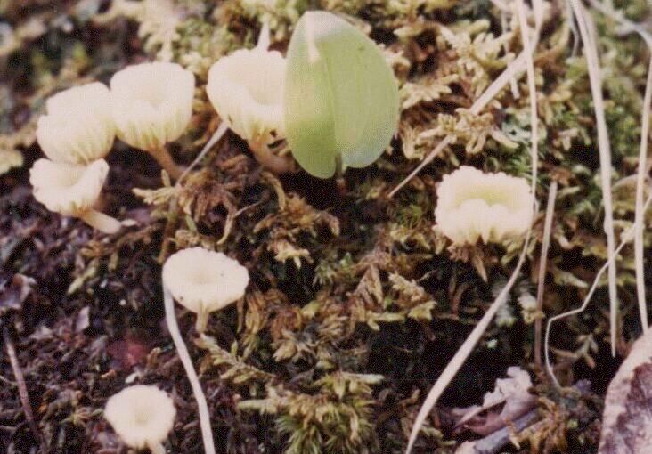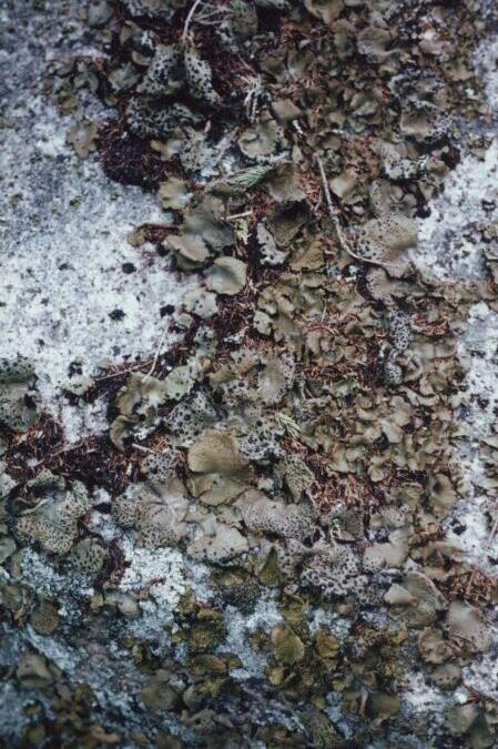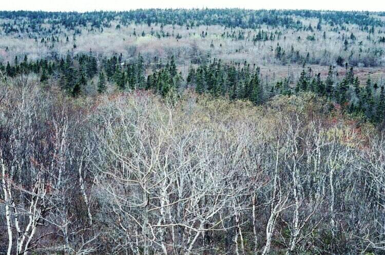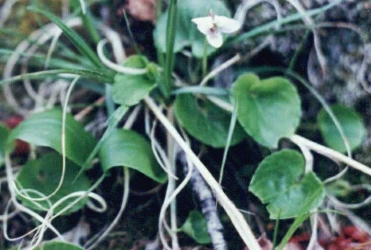 West Pine Island Pond - Granite Ridge between West Pine Island and Duck Pond | We now go up on to the ridge between East and West Pine Island Ponds, and have a view of West Pine Island Pond. The sprouting and blossoming trees paint the landscape in pastel shades which contrast with the bright colours of autumn. We go down to West Pine Island Pond. This green rock tripe, growing on a granite boulder by the lake, is very noticeable today, because of the weather. Even harder to overlook is a sequence of white tree fungi. We pass many more granite boulders on which rock tripe and lichen are growing. On this boulder there is some rock tripe resembling leaves. As we head up towards the granite ridge between West Pine Island Pond and Duck Pond, we stumble upon a lone white violet growing in the woods. Once we are on the crest of the ridge, we can enjoy the view over the birches and maples towards East Pine Island Pond. Later we have a view across the valley of the McIntosh Run. While we are on the ridge we also see this sprouting tamarack and British soldier lichen growing amidst rock tripe. |