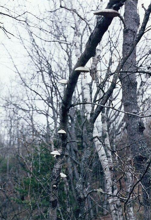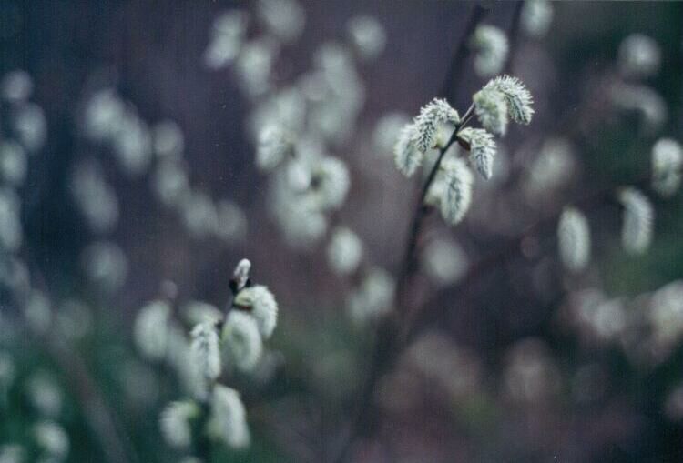 York Redoubt - East Pine Island Pond | Our point of departure is the church near York Redoubt. Walking along the old road next to the fort, we look across a stand of red tinged maples to the sea. A little further on we notice some lichens and polypody ferns and some white birch catkins. These young aspen leaves delight the eye as the sun shines through them. We now begin to walk downhill to East Pine Island Pond. Just before reaching it we see these yellow willow blossoms. At the lake we see that many different kinds of trees are sprouting and blossoming. |