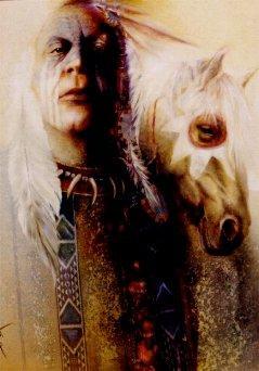 One morning when he went to the little valley in which his horses were kept, he found in the herd an ugly white stallion. He was old, with crooked legs and a matted coat, thin, and tired looking. The Traveler flew into a rage. He took his rawhide rope and caught the poor old horse. Then with a club he beat him unmercifully. When the animal fell to the ground stunned, The Traveler broke his legs with the club and left him to die. He returned to his lodge, feeling not the slightest bit of remorse for his cruelty. Later, deciding he might as well have the hide of the old horse, he returned to the place where he had left him. But to his surprise the white stallion was gone. That night as The Traveler slept, he had a dream. The white stallion appeared to him and slowly turned into a beautiful horse, shining white, with long mane and tail - a horse more lovely than any The Traveler had ever seen. Then the Stallion spoke: "If you had treated me kindly," it said, "I would have brought you more horses. You were cruel to me, so I shall take away the horses you have!" When The Traveler awoke, he found his horses were gone. All that day, he walked and searched, but when at nightfall he fell asleep exhausted, he had found no trace of them. In his dreams the White Stallion came again and said, "Do you wish to find your horses? They are north, by a lake. You will sleep twice, before you come to it." As soon as he awakened in the morning, The Traveler hastened northward. Two days' journey and when he came to the lake there were no horses. That night, the Ghost Stallion came again. "Do you wish to find your horses?" it said. "They are east, in some hills. You will sleep twice before you came to the place." | ||||||||||||||||||