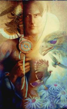 Once, long ago, when all the people were out in the mountains on a great hunt one man who had gone on ahead climbed to the top of a high ridge and found a large river on the other side. While he was looking across he saw an old man walking about on the opposite ridge, with a cane that seemed to be made of some bright, shining rock. The hunter watched and saw that every little while the old man would point his cane in a certain direction, then draw it back and smell the end of it. At last he pointed it in the direction of the hunting camp on the other side of the mountain, and this time when he drew back the staff he sniffed it several times as if it smelled very good, and then started along the ridge straight for the camp. He moved very slowly, with the help of the cane, until he reached the end of the ridge, when he threw the cane out into the air and it became a bridge of shining rock stretching across the river. After he had crossed over upon the bridge it became a cane again, and the old man picked it up and started over the mountain toward the camp. The hunter was frightened and felt sure that it meant mischief, so he hurried on down the mountain and took the shortest trail back to the camp to get there before the old man. When he got there and told his story the Adawehi said the old man was a wicked cannibal monster called Nvyvnuwi-Dressed In Stone, who lived in that part of the country, and was always going about the mountains looking for some hunter to kill and eat. It was very hard to escape from him, because his stick guided him like a dog, and it was nearly as hard to kill him, because his whole body was covered with a skin of solid rock. If he came he would kill and eat them all, there was only one way to save themselves. He could not bear to look upon a woman in her Moon-time, and if they could find seven virgins, each in their Moon-time,one from each of the seven clans, to stand in the path as he came along the sight would kill him. So they asked among all the women, and found seven who were in that way, and with one it had just begun. By the order of the Adawehi they stripped themselves and stood along the path where the old man would come. Soon they heard Nvyvnuwi coming through the woods, feeling his way with the stone cane. He came along the trail to where the first woman was standing, and as he saw her he started and cried out: "Yu! My grandchild; you are in a very bad state!" He hurried past her, but in a moment he met the next woman, and cried out again: "Yu! My child; you are in a terrible way," and hurried past her, but now he was vomiting blood. He hurried on and met the third and the fourth and the fifth woman, but with each one that he saw his step grew weaker until when he came to the last one, with whom it had just begun, the blood poured from his mouth and he fell down the trail. The Adawehi drove seven sourwood stakes through his body and pinned him to the ground, and when night came they piled great logs over him and set fire to them, and all the people gathered around to see. Nvyvnuwi was very wise and knew many secrets, and now as the fire came close to him he began to talk, and told them the medicine for all kinds of sickness. At midnight he began to sing, and sang the hunting songs for calling up deer, bear and all the animals of the woods and mountains. As the blaze grew hotter his voice sank lower and lower, until at last when daylight came, the logs were a heap of white ashes and the voice was still. The Adawehi told them to rake off the ashes, and where the body had lain they found only a large lump of wa'di paint and a magic Ulvnsuti stone. He kept the stone for himself, and calling the people around him he painted them, on face and breast, with the red wo'di, and whatever each person prayed for while the painting was being done-whether for hunting success, for working skill, or for long life-that gift was his. Art work on this page by permission of Denton Lund see link below. | |||||||||||||||||||