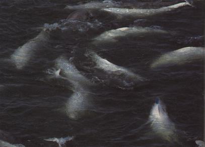 Beluga whales have a diverse diet of many species of fish, squid, crab shrimp, clams and worms and may be called bottom feeders. Their teeth are not very sharp. They may use them to hold their prey but their food is swallowed whole. According to research, they seem to have a developed sense of taste and may taste the water before they taste their food. They prefer to feed in shallow water where they usually feed alone. When at sea, they hunt cooperatively and are able to dive up to 21fathoms.(1) Although they generally stay underwater for no more than a few minutes at a time they have been known to stay submerged for up to 15 minutes.