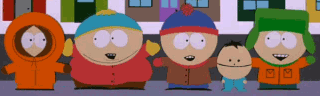 O štai čia - vieni iš mano mėgstamiausi animacinių filmų personažai (iš kairės): Kenny, Cartman, Stan, Ike, Kyle. |