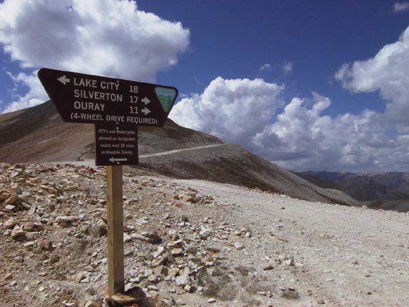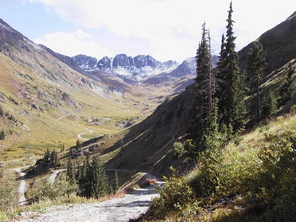From 12,800 foot Engineer Pass down to the town of Ouray, you lose 5000 feet in 12 miles, most of it on a very steep jeep road, but the last few miles are on paved Highway 550 coming down from Red Mountain Pass. In my haste to reach tree line before the rain reached us, I cruised past an intersecting jeep road without noticing the sign pointing to Ouray. I was headed down a jeep road that would have brought us back to Silverton, several days early. Jeanne behind me yelled for me to stop without success. Putting her entire being into a final "LIIINNNCOOOOLLLLN!", she managed to attract my attention and get me turned around, to the relief of both of us.