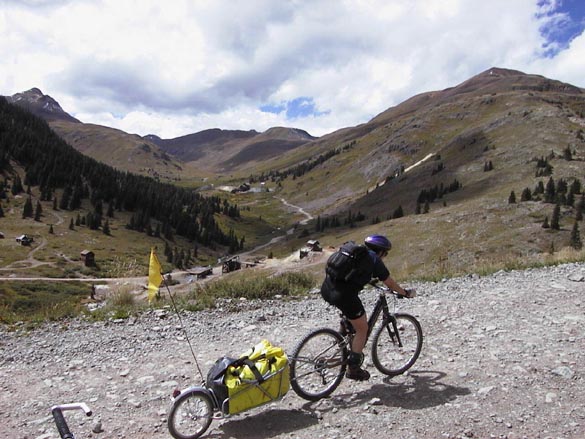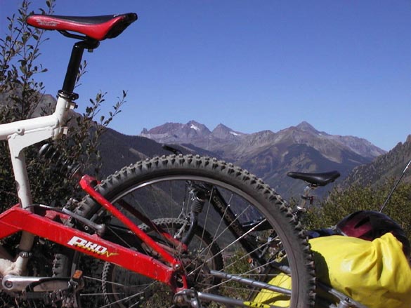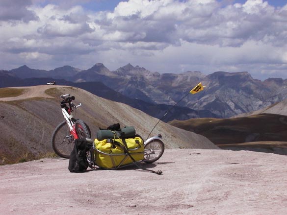 We rode on the weekends as well. A couple of weeks before the pass to pass ride was to start, we spent three days on a trial run, pulling the 50 and 40 pound loaded trailers over a 2000 foot climb on old jeep roads in the Elk Mountains to a secluded alpine basin near the Maroon Bell peaks. We were astounded at how tough it was, despite our training rides and super low gears. We had to get off and drag the bikes up several portions of the climb, and found that pushing was as tough as riding. We seriously discussed not doing the pass to pass trip, then decided to try it, with the condition that we could always short-cut back to the car over 11,000 foot paved Red Mountain Pass after the first two jeep passes if things weren't going well.
