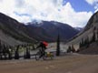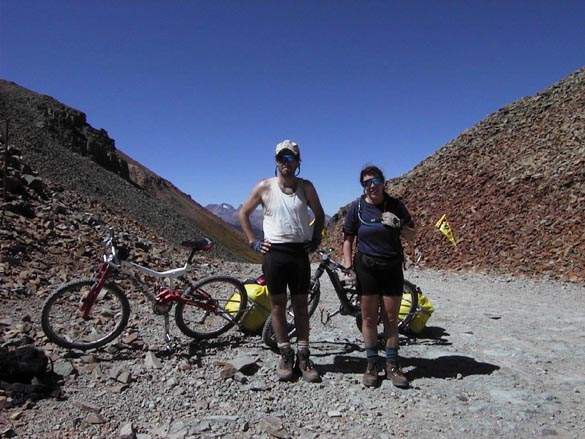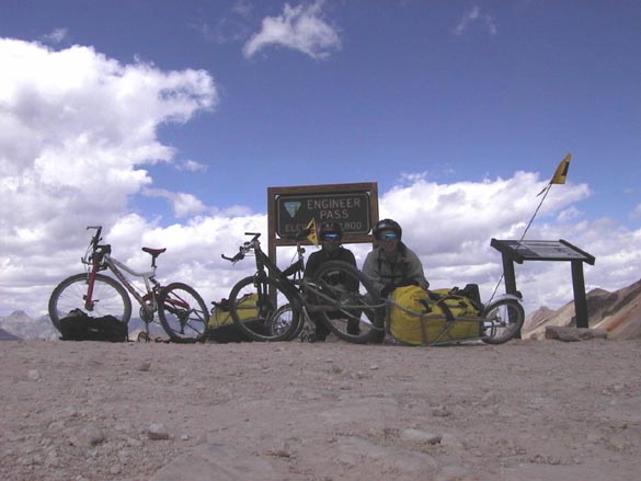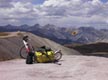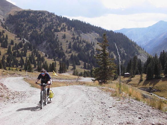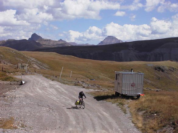 At the top of the 12,640-foot high pass, the four passengers of one vehicle cheered and clapped as I crested the last steep climb. I bowed, then raced to get the camera out to photograph Jeanne pedaling up, to more applause. Donning wind jackets and winter gloves, we cruised happily on down the east side of the pass to a nice campsite just below a beautiful timber-free glacial valley called American Basin.