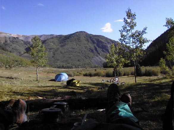 We started up the road again towards Engineer Pass. It didn't take us long to decide on an easy day. I was having stomach problems and my legs felt like jelly. Jeanne wasn't opposed to the idea of cutting the day's ride short for some serious high mountain rest and relaxation. After just over 5 miles and 1100 feet of elevation gain, we found a spur road leading to an isolated meadow complete with a stream and beaver pond, ringed on all sides by high mountains. We set up our tent, and lounged on a space blanket in the meadow, alternating between reading and watching the wildlife and the colors change on the peaks as clouds passed over.