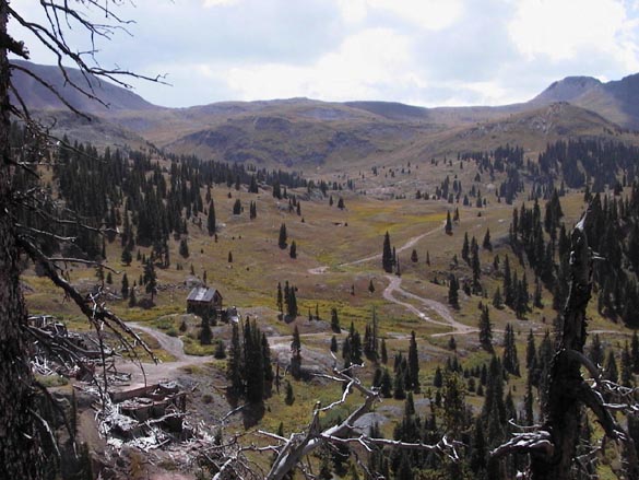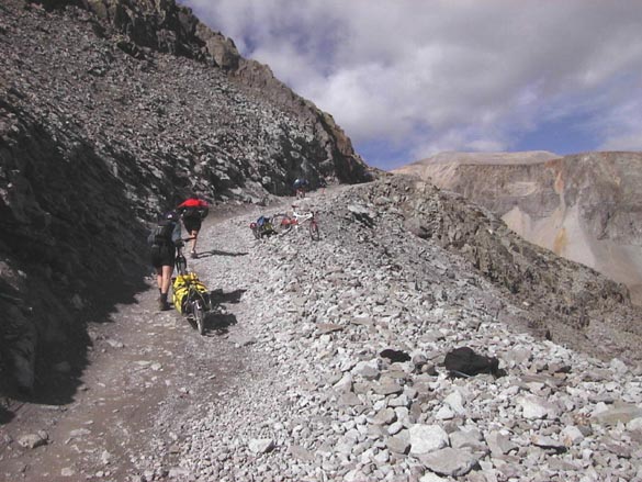 After this first steep section, we were able to ride, with difficulty, most of the road up to Upper Camp Bird, a mining ghost town at the edge of tree line, where we stopped for lunch. Feeling good, we opted to continue up the switchbacks that stretched up the valley wall ahead. The road became progressively steeper and rougher, reducing our progress to a push and stop, one mile per hour rate, then even slower as we were forced to combine our efforts on one bike, then go back for the other on each steep incline. We crested the headwall of the valley, and were rewarded with a tantalizing view of the top of the pass, perhaps 1 mile and 500 feet above us. We also were concerned to see heavy dark clouds spilling over the pass in our direction.