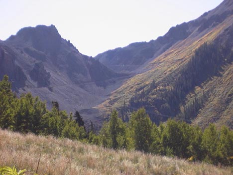 At three in afternoon, we began the long climb on paved road 145 south from Telluride towards Ophir. The weather had turned incredibly nice. Blue skies, no clouds, Aspen trees beginning to turn bright yellow, the rich smells of the beginning of autumn. We pedaled along admiring the views of 14,017-foot high Mt. Wilson a few miles to the southwest. After a nice, high speed downhill, we turned east onto the unpaved Ophir Road, and pedaled uphill towards the old town. As we did so, we pedaled across the run out paths of several major avalanche chutes.